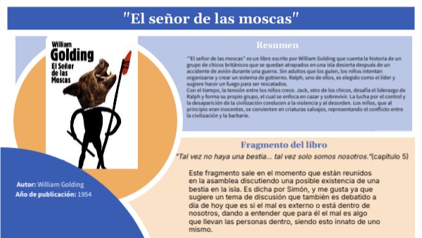 ‘"El señor de las moscas" es un libro escrito por William Golding que cuenta la historia de un grupo de chicos británicos que se quedan atrapados en una isla desierta después de un accidente de avión durante una guerra. Sin adultos que los guíen, los niños intentan organizarse y crear un sistema de gobierno. Ralph, uno de ellos, es elegido como el líder y sugiere hacer un fuego para ser rescatados.Con el tiempo, la tensión entre los niños crece. Jack, otro de los chicos, desafía el liderazgo de Ralph y forma su propio grupo, el cual se enfoca en cazar y sobrevivir. La lucha por el control y la desaparición de la civilización conducen a la violencia y al desorden. Los niños, que al principio eran inocentes, se convierten en criaturas salvajes, representando el conflicto entre la civilización y la barbarie.
