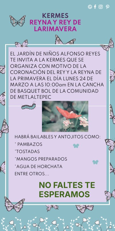 EL JARDÍN DE NIÑOS ALFONSO REYES TE INVITA A LA KERMES QUE SE ORGANIZA CON MOTIVO DE LA CORONACIÓN DEL REY Y LA REYNA DE LA PRIMAVERA EL DÍA LUNES 24 DE MARZO A LAS 10:00am EN LA CANCHA DE BASQUET BOL DE LA COMUNIDAD DE METLALTEPEC