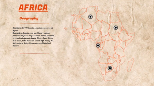 Standard: SS7G1 Locate selected features of Africa. Element: a. Locate on a world and regional political-physical map: Sahara, Sahel, savanna, tropical rain forest, Congo River, Niger River, Nile River, Lake Victoria, Great Rift Valley, Mt. Kilimanjaro, Atlas Mountains, and Kalahari Desert.