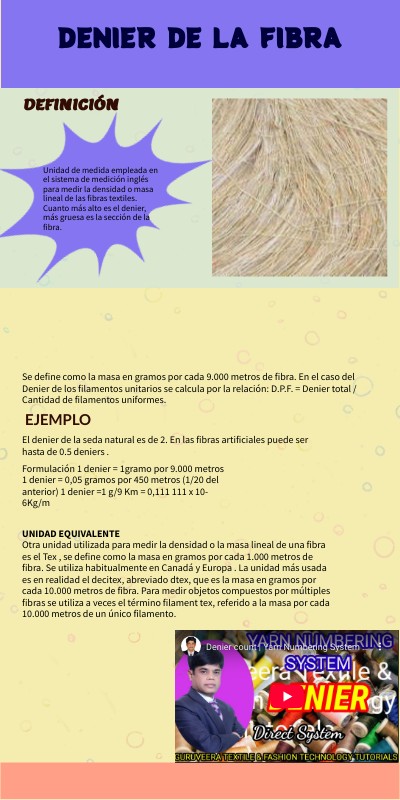 Se define como la masa en gramos por cada 9.000 metros de fibra. En el caso del Denier de los filamentos unitarios se calcula por la relación: D.P.F. = Denier total / Cantidad de filamentos uniformes.