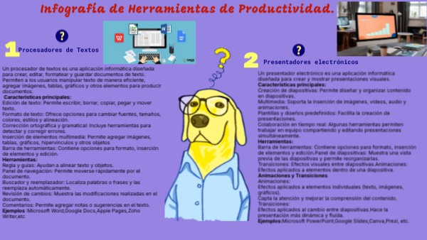 Un procesador de textos es una aplicación informática diseñada para crear, editar, formatear y guardar documentos de texto. Permiten a los usuarios manipular texto de manera eficiente, agregar imágenes, tablas, gráficos y otros elementos para producir documentos. Caracteristicas principales: Edición de texto: Permite escribir, borrar, copiar, pegar y mover texto. Formato de texto: Ofrece opciones para cambiar fuentes, tamaños, colores, estilos y alineación. Corrección ortográfica y gramatical: Incluye herramientas para detectar y corregir errores. Inserción de elementos multimedia: Permite agregar imágenes, tablas, gráficos, hipervínculos y otros objetos Barra de herramientas: Contiene opciones para formato, inserción de elementos y edición. Herramientas: Regla y guías: Ayudan a alinear texto y objetos. Panel de navegación: Permite moverse rápidamente por el documento. Buscador y reemplazador: Localiza palabras o frases y las reemplaza automáticamente. Revisión de cambios: Muestra las modificaciones realizadas en el documento. Comentarios: Permite agregar notas o sugerencias en el texto. Ejemplos :Microsoft Word,Google Docs,Apple Pages,Zoho Writer,etc
