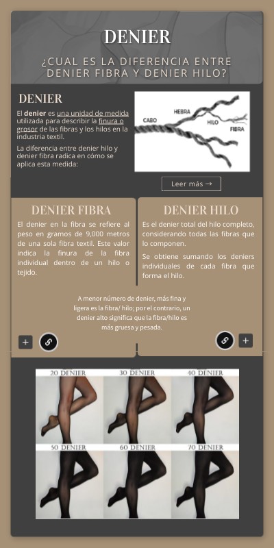 A menor número de denier, más fina y ligera es la fibra/ hilo; por el contrario, un denier alto significa que la fibra/hilo es más gruesa y pesada.