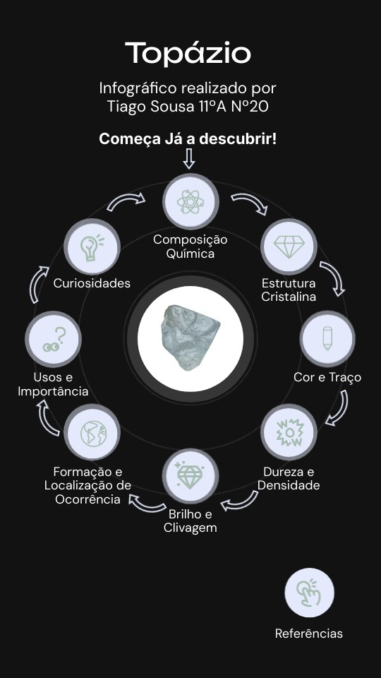 O Topázio tem 8 de Dureza segundo a escala de Mohs e 3,5 g/cm³ de densidade.