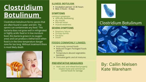 Clostridium botulinum forms spores that are often found in water and dirt. The spores can contaminate any food. This bacteria does not grow well in refrigerated or highly acidic food or in low moisture food, this bacteria grows in no oxygen areas and can produce a lethal toxin when food is in the time temperature danger zone for too long. Without treatment there is most likely death.