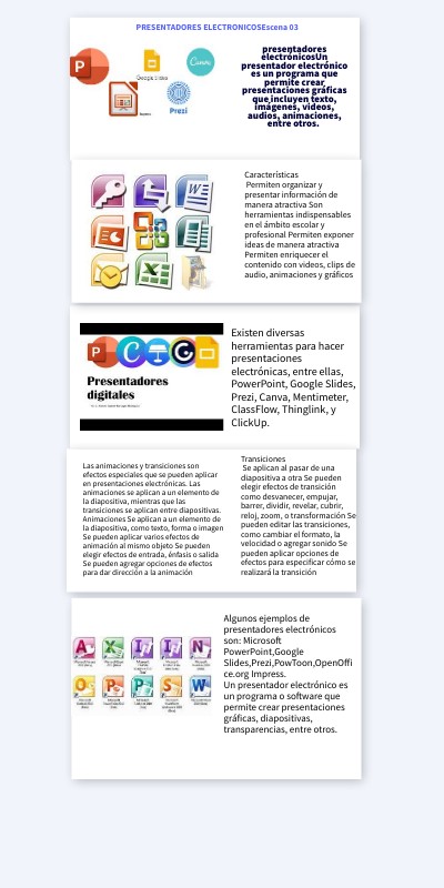 presentadores electrónicosUn presentador electrónico es un programa que permite crear presentaciones gráficas que incluyen texto, imágenes, videos, audios, animaciones, entre otros.
