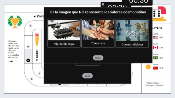 The game can be played by 2 to 4 players. Each player must choose a chip (yellow, blue, red or green) and roll the dice. The player who gets the highest number will be the one to start the game. To play, each participant must roll the dice and move his/her piece to the corresponding square. In each square there must be a question about "Sports". If he/she answers correctly, he/she can move forward, if not, it is the next player's turn. On the board there are also 6 special squares (in gray with the number in black) in which the player loses a turn without playing. The player who reaches the finish line first wins.