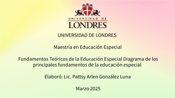 UNIVERSIDAD DE LONDRES Maestría en Educación Especial Fundamentos Teóricos de la Educación Especial Diagrama de los principales fundamentos de la educación especial Elaboró: Lic. Pattsy Arlen González Luna Marzo 2025