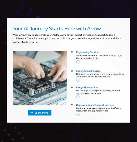 Work with Arrow to accelerate your AI deployment with expert engineering support, tailored, scalable platforms for any application, and validated, end-to-end integration services that deliver faster, reliable results.