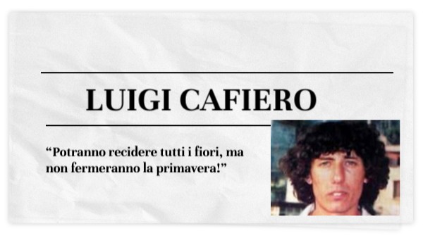 Luigi Cafiero venne assassinato a Torre Annunziata in via Settetermini con undici colpi d’arma da fuoco a soli 18 anni il 21 aprile del 1982, mentre era in auto con la fidanzata Annamaria. Quattro uomini armati di pistola, si avvicinarono all’auto di Luigi e gli urlarono: «Sei Antonio?». Senza attendere la risposta, esplosero contro di lui undici colpi d’arma da fuoco che lo uccisero all’istante. La fidanzata, raggiunta da cinque proiettili, viene ferita mentre Luigi muore sul colpo. A condannare Luigi una forte somiglianza con un'altra persona, un certo Antonio, che aveva probabilmente un conto in sospeso con la malavita. Ma solo undici anni dopo, in seguito alle dichiarazioni di un pentito è stato accertato che si trattò realmente di un errore di persona.