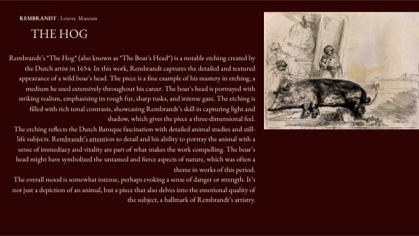 Rembrandt’s *The Hog* (also known as *The Boar's Head*) is a notable etching created by the Dutch artist in 1654. In this work, Rembrandt captures the detailed and textured appearance of a wild boar's head. The piece is a fine example of his mastery in etching, a medium he used extensively throughout his career. The boar's head is portrayed with striking realism, emphasizing its rough fur, sharp tusks, and intense gaze. The etching is filled with rich tonal contrasts, showcasing Rembrandt’s skill in capturing light and shadow, which gives the piece a three-dimensional feel. The etching reflects the Dutch Baroque fascination with detailed animal studies and still-life subjects. Rembrandt’s attention to detail and his ability to portray the animal with a sense of immediacy and vitality are part of what makes the work compelling. The boar’s head might have symbolized the untamed and fierce aspects of nature, which was often a theme in works of this period. The overall mood is somewhat intense, perhaps evoking a sense of danger or strength. It’s not just a depiction of an animal, but a piece that also delves into the emotional quality of the subject, a hallmark of Rembrandt’s artistry.