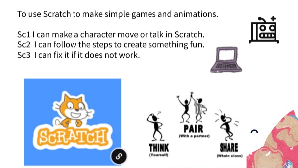 To use Scratch to make simple games and animations. Sc1 I can make a character move or talk in Scratch. Sc2 I can follow the steps to create something fun. Sc3 I can fix it if it does not work.
