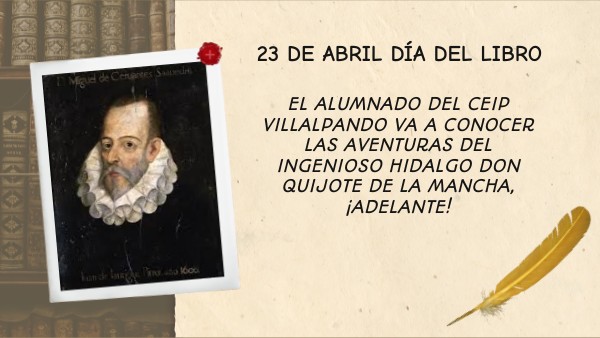 El 23 de abril se celebra el Día del Libro para conmemorar la muerte de Miguel de Cervantes, uno de los grandes escritores de la literatura española. Desde el CEIP Villalpando queremos acercar este autor a los niños y niñas a través de su obra más importante:El Ingenioso Hidalgo Don Quijote de la Mancha
