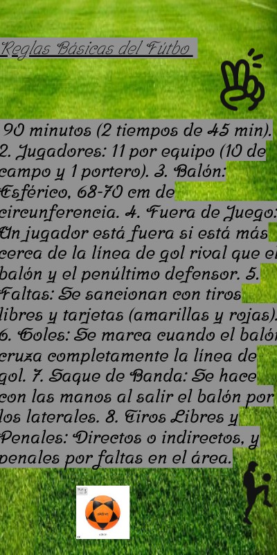 Reglas Básicas del Fútbo 90 minutos (2 tiempos de 45 min). 2. Jugadores: 11 por equipo (10 de campo y 1 portero). 3. Balón: Esférico, 68-70 cm de circunferencia. 4. Fuera de Juego: Un jugador está fuera si está más cerca de la línea de gol rival que el balón y el penúltimo defensor. 5. Faltas: Se sancionan con tiros libres y tarjetas (amarillas y rojas). 6. Goles: Se marca cuando el balón cruza completamente la línea de gol. 7. Saque de Banda: Se hace con las manos al salir el balón por los laterales. 8. Tiros Libres y Penales: Directos o indirectos, y penales por faltas en el área.
