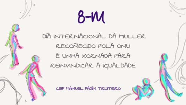 Un ano máis celebramos na nosa escola o 8-M, día no que pedimos a igualdade entre homes e mulleres, a supresión das fendas laborais, a desaparición da violencia en todos os ámbitos. Queremos camiñar cara a unha sociedade máis xusta.