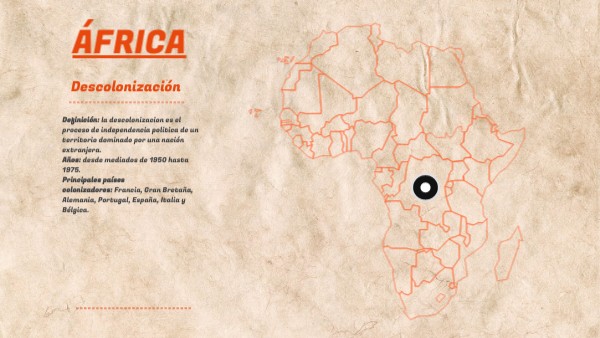 Definición: la descolonizacion es el proceso de independencia politica de un territorio dominado por una nación extranjera.Años: desde mediados de 1950 hasta 1975. Principales países colonizadores: Francia, Gran Bretaña, Alemania, Portugal, España, Italia y Bélgica.