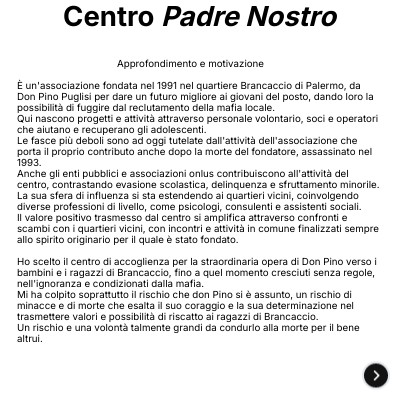 Caro Padre Pino, Sono Davide, uno studente che ha avuto l'opportunità di conoscere il suo incredibile impegno. Ho deciso di scriverle per esprimere quanto mi ha colpito la sua tenacia nella fondazione del centro Padre Nostro e la sua dedizione al suo sviluppo e alla sua utilità. La scelta di dedicarsi ai giovani di Brancaccio mi ha fatto capire il vero significato del coraggio nella forma di aiutare i bambini e i ragazzi del quartiere. In un ambiente dominato dal terrore e dalla criminalità organizzata, lei ha scelto di offrire riparo e alternative concrete alla loro crescita, sfidando apertamente la mafia con forza di fede e umanità. Penso all'eredità morale che il centro ha lasciato e all'insegnamento che ne deriva perchè sono valori che noi tutti dovremmo portare avanti per crearci un futuro migliore. Personalmente, ho compreso quanto sia importante non voltarsi mai dall'altra parte di fronte alle ingiustizie e quanto conti agire con coraggio, anche quando è rischioso. Lei è stato una fonte di integrità e speranza. Seguendo il suo esempio noi possiamo continuare a combattere le ingiustizie costruendo una società più equa dove le persone siano libere da soprusi ed estorsioni. La ringrazio caldamente per tutto ciò che ha fatto e continua a rappresentare per chi crede nell'ordine e nella giustizia. La sua eredità è una grande guida per noi, mi auguro di riuscire a vivere secondo i valori che lei ci ha trasmesso.