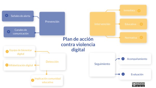 Mapa mental del plan de actuaciones que se deben llevar a cabo para implementar un plan de acción contra la violencia digital en centros educativos