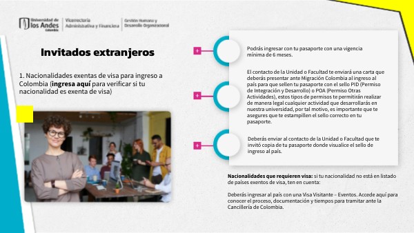 El contacto de la Unidad o Facultad te enviará una carta que deberás presentar ante Migración Colombia al ingreso al país para que sellen tu pasaporte con el sello PID (Permiso de Integración y Desarrollo) o POA (Permiso Otras Actividades), estos tipos de permisos te permitirán realizar de manera legal cualquier actividad que desarrollarás en nuestra universidad, por tal motivo, es importante que te asegures que te estampillen el sello correcto en tu pasaporte.