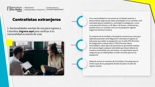 Si tu nacionalidad se encuentra en el listado anterior y desarrollarás algunas de estas actividades en tu contrato civil: actividad apoyo académico, actividad investigación, curso corta duración (menor a 30 días o 30 horas), conferencias, podrás tener un contrato civil con el pasaporte vigente (vigencia mínima 6 meses)
