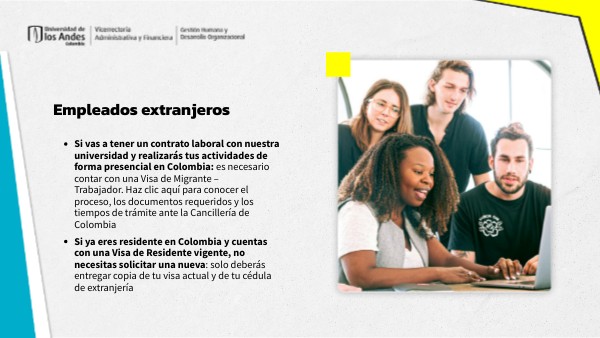 - Si vas a tener un contrato laboral con nuestra universidad y realizarás tus actividades de forma presencial en Colombia: es necesario contar con una Visa de Migrante – Trabajador. Haz clic aquí para conocer el proceso, los documentos requeridos y los tiempos de trámite ante la Cancillería de Colombia