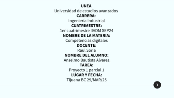 UNEA Universidad de estudios avanzadosCARRERA: Ingeniería Industrial CUATRIMESTRE: 1er cuatrimestre IIADM SEP24 NOMBRE DE LA MATERIA: Competencias digitales DOCENTE: Raul Soria NOMBRE DEL ALUMNO: Anselmo Bautista Alvarez TAREA: Proyecto 1 parcial 1 LUGAR Y FECHA: Tijuana BC 29/MAR/25
