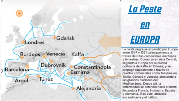 La peste negra se expandió por Europa entre 1347 y 1351, principalmente a través de rutas comerciales marítimas y terrestres. Comenzó en Asia Central, llegando a Europa por la ciudad portuaria de Kaffa en Crimea, y se propagó rápidamente a través de puertos comerciales como Messina en Sicilia, Génova y Venecia, afectando a las grandes ciudades del Mediterráneo. Desde allí, la enfermedad se extendió hacia el norte, llegando a Francia, Inglaterra, España y Alemania. Tras esto, atravesó escandinavia y el baltico.