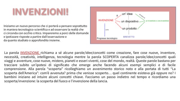 La parola INVENZIONE richiama a sé alcune parole/idee/concetti come creazione, fare cose nuove, inventore, necessità, creatività, intelligenza, tecnologia mentre la parola SCOPERTA canalizza parole/idee/concetti quali viaggi e avventure, cose nuove, mistero, pianeti e esseri viventi, cose del mondo, realtà. Queste parole bastano per tracciare subito un’ipotesi di significato che emerge anche facendo alcuni esempi semplici e di facile comprensione. Alla parola “scoperta” ricolleghiamo un avvenimento storico noto e alla portata di tutti “La scoperta dell’America”: com’è avvenuta? prima che venisse scoperto… quel continente esisteva già oppure no? I bambini iniziano ad intuire alcuni concetti chiave. Facciamo un passo indietro nel tempo e ricordiamo una scoperta/invenzione: la scoperta del fuoco e l’invenzione della lancia.