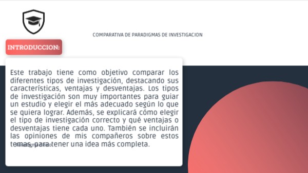 Este trabajo tiene como objetivo comparar los diferentes tipos de investigación, destacando sus características, ventajas y desventajas. Los tipos de investigación son muy importantes para guiar un estudio y elegir el más adecuado según lo que se quiera lograr. Además, se explicará cómo elegir el tipo de investigación correcto y qué ventajas o desventajas tiene cada uno. También se incluirán las opiniones de mis compañeros sobre estos temas, para tener una idea más completa.