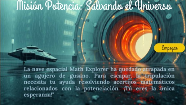 La nave espacial Math Explorer ha quedado atrapada en un agujero de gusano. Para escapar, la tripulación necesita tu ayuda resolviendo acertijos matemáticos relacionados con la potenciación. ¡Tú eres la única esperanza!"
