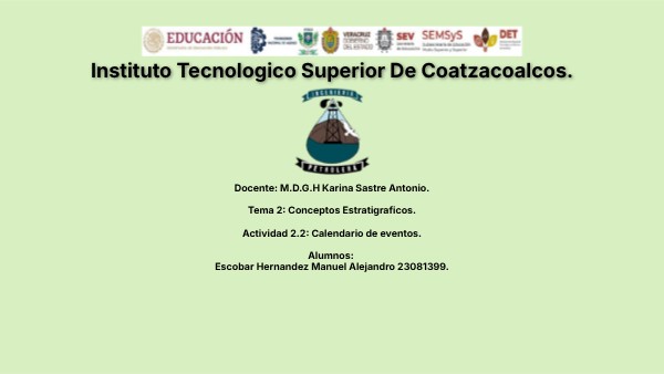 Docente: M.D.G.H Karina Sastre Antonio. Tema 2: Conceptos Estratigraficos. Actividad 2.2: Calendario de eventos. Alumnos: Escobar Hernandez Manuel Alejandro 23081399.