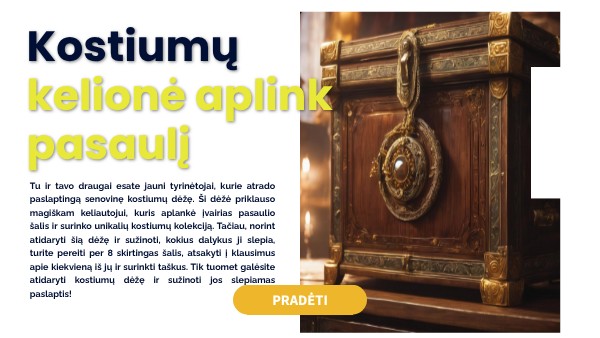 Tu ir tavo draugai esate jauni tyrinėtojai, kurie atrado paslaptingą senovinę kostiumų dėžę. Ši dėžė priklauso magiškam keliautojui, kuris aplankė įvairias pasaulio šalis ir surinko unikalių kostiumų kolekciją. Tačiau, norint atidaryti šią dėžę ir sužinoti, kokius dalykus ji slepia, turite pereiti per 8 skirtingas šalis, atsakyti į klausimus apie kiekvieną iš jų ir surinkti taškus. Tik tuomet galėsite atidaryti kostiumų dėžę ir sužinoti jos slepiamas paslaptis!