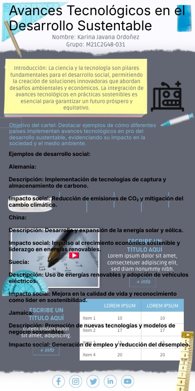 Objetivo del cartel: Destacar ejemplos de cómo diferentes países implementan avances tecnológicos en pro del desarrollo sustentable, evidenciando su impacto en la sociedad y el medio ambiente.