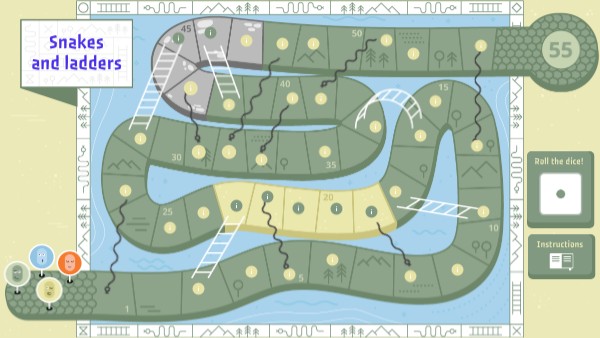 Players start with a token - which represents each of them - in the initial square and take turns rolling the die. The tokens move according to the numbering on the board, in ascending order. If, at the end of a move, a player lands on a square where a ladder begins, they move up it to the square where it ends. If, on the other hand, they land on a square where a snake's tail begins, they move down it to the square where its head ends. If a player rolls a 6, they can move twice in a single turn. If a player rolls three consecutive 6's, they must return to the initial square and cannot move their token until they roll a 6 again. The player who reaches the final square is the winner. There is a variation where, if a player is six or fewer squares away from the end, they must roll precisely the number needed to reach it. If the number rolled exceeds the number of remaining squares, the player cannot move.