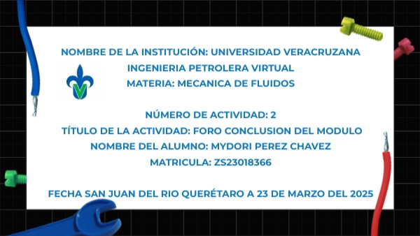 NOMBRE DE LA INSTITUCIÓN: UNIVERSIDAD VERACRUZANA INGENIERIA PETROLERA VIRTUAL MATERIA: MECANICA DE FLUIDOS NÚMERO DE ACTIVIDAD: 2 TÍTULO DE LA ACTIVIDAD: FORO CONCLUSION DEL MODULO NOMBRE DEL ALUMNO: MYDORI PEREZ CHAVEZ MATRICULA: zs23018366 FECHA SAN JUAN DEL RIO QUERÉTARO A 23 DE MARZO DEL 2025