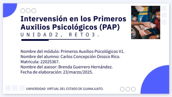 Nombre del módulo: Primeros Auxilios Psicológicos V1.Nombre del alumno: Carlos Concepción Orozco Rico.Matricula: 22025367. Nombre del asesor: Brenda Guerrero Hernández. Fecha de elaboración: 23/marzo/2025.