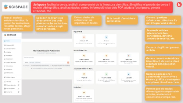 Scispace facilita la cerca, anàlisi i comprensió de la literatura científica. Simplifica el procés de cerca i revisió bibliogràfica, analitza dades, extreu informació clau dels PDF, ajuda a l'escriptura, genera citacions, etc.