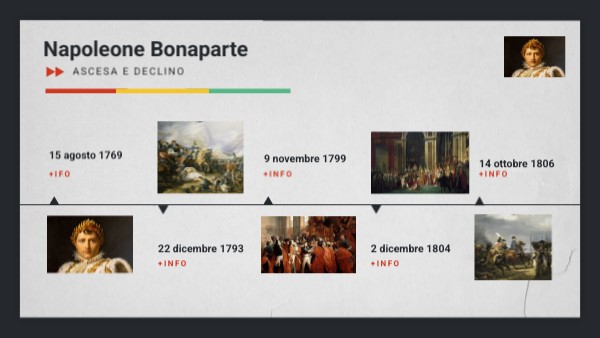 15 agosto 1769: Nascita di Napoleone Bonaparte Napoleone nasce ad Ajaccio, in Corsica, da una famiglia della piccola nobiltà locale. La Corsica era stata ceduta dalla Repubblica di Genova alla Francia appena un anno prima. Durante i primi anni della sua giovinezza, Napoleone si sente più “italiano” che francese e simpatizza in ogni caso per una Corsica indipendente. 22 dicembre 1793: Ascesa militare durante l’assedio di Tolone Durante l’assedio di Tolone, Napoleone si distingue per il suo coraggio e le sue capacità strategiche, ottenendo una promozione a generale di brigata. Questo evento segna l’inizio della sua rapida ascesa nel panorama militare francese. 9 novembre 1799: Colpo di Stato del 18 Brumaio Napoleone partecipa a un complotto che rovescia il Direttorio il 9–10 novembre (18–19 Brumaio nel calendario repubblicano francese). Questo evento è spesso considerato la fine effettiva della Rivoluzione francese. Un nuovo governo, il Consolato, viene istituito e Napoleone diventa primo console, ovvero leader della Francia. 2 dicembre 1804: Incoronazione a Imperatore dei Francesi Napoleone si autoincorona Imperatore dei Francesi nella cattedrale di Notre-Dame a Parigi, consolidando il suo potere e segnando la nascita del Primo Impero Francese. L’evento rappresenta l’apice della sua carriera politica. 14 ottobre 1806: Battaglia di Jena-Auerstädt Napoleone ottiene una decisiva vittoria contro l’esercito prussiano nelle battaglie di Jena e Auerstädt, consolidando la sua supremazia in Europa centrale. Questi successi militari rafforzano ulteriormente la sua posizione di leader incontrastato.