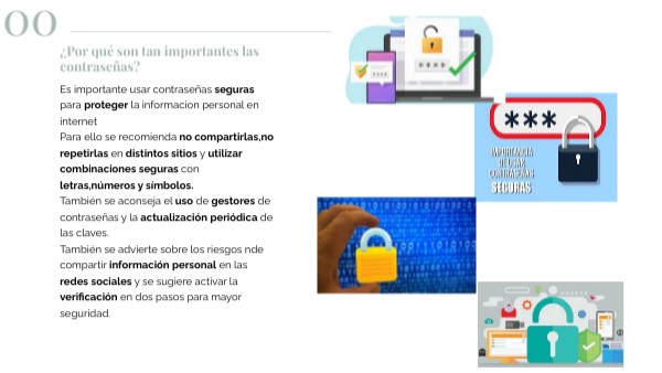 Es importante usar contraseñas seguras para proteger la informacion personal en internet Para ello se recomienda no compartirlas,no repetirlas en distintos sitios y utilizar combinaciones seguras con letras,números y símbolos. También se aconseja el uso de gestores de contraseñas y la actualización periódica de las claves. También se advierte sobre los riesgos nde compartir información personal en las redes sociales y se sugiere activar la verificación en dos pasos para mayor seguridad.