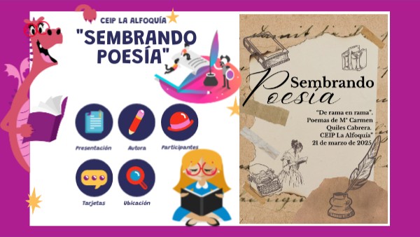 Con motivo del día de la Poesía y, desde la biblioteca del centro (Coordinadora: Irina Gálvez Garre), se ha tomado la idea del CEIP Federico García Lorca de Vícar para llevar a cabo este proyecto. La actividad ha consistido en preparar y recitar los poemas del libro "De rama en rama" de Mª Carmen Quiles para, posteriormente, grabarlos en formato audio que se han transformado en un código QR. Dichos códigos se han impreso y colgado por algunos lugares de intéres de la localidad para ser reproducidos por teléfonos móviles, tablets...
