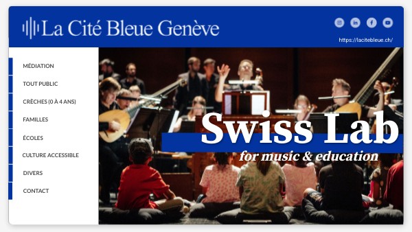Regroupant toutes les actions de médiation portées par La Cité Bleue à Genève, le SwissLab est un projet ambitieux qui vise à la fois l’éveil musical et artistique pour tous les âges — y compris les publics empêchés — et l’aide à la professionnalisation des jeunes musiciens. Il propose un large éventail d’activités éducatives, artistiques et sociales : spectacles familles et scolaires, ateliers, masterclasses, conférences, garderie créative (Récré Bleue), rencontres avec les artistes, etc.