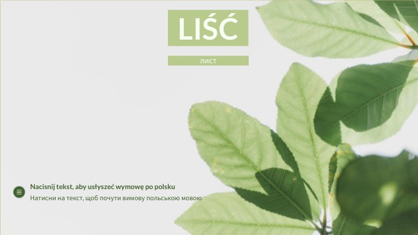 Fotosynteza czyli produkcja pożywienia (cukru prostego), zachodzi w liściu. Kliknij na liść i dowiedz się więcej. Фотосинтез, тобто виробництво їжі (простого цукру), відбувається в листі. Натисни на листок і дізнайся більше.