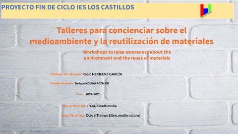 El proyecto se contextualiza dentro del modulo de ''Actividades de ocio y tiempo libre'' con el bloque de contenidos ''Realización de actividades de ocio y tiempo libre en el medio natural''. El proyecto se basa en el diseño, planificación, desarrollo y creación de talleres medioambientales sostenibles que promueven el respeto al entorno, la conciencia ecológica, la reutilización de materiales y la educación ambiental. Todo esto se consigue mediante actividades lúdicas, creativas y prácticas aplicando las metodologías del aprendizaje basado en proyectos (ABP) y la gamificación, éstas promueven un aprendizaje significativo y la adquisición de nuevos conocimientos de una manera directa y divertida. Un ejemplo de taller es la realización de una casa de pajaros con un tetrabrick de leche reciclado. Como objetivos del proyecto tenemos diseñar y elaborar talleres medioambientales sostenibles de manera creativa y manipulativa (manualmente) que ayuden a fomentar la conciencia ecológica de los clientes y la importancia de la reutilización de materiales reciclados; promover la cooperación, organización y resolución de problemas mediante el trabajo en equipo; emplear una metodología activa como el aprendizaje basado en proyectos (ABP) y la gamificación para una mejor experiencia, motivación y participación de los clientes en los talleres. La estructura se divide en 3 puntos: diseño del taller y las herramientas para evaluarlo, el desarrollo del taller y el analisis y evaluación final.