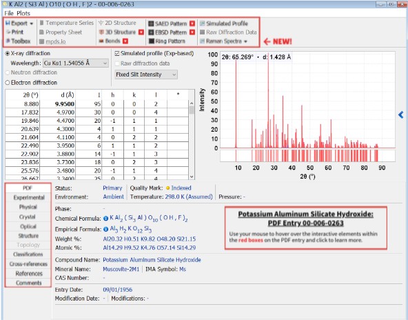Crystal: This tab displays general crystallographic data for the PDF entry as calculated by ICDD, such as the space group and unit cell.