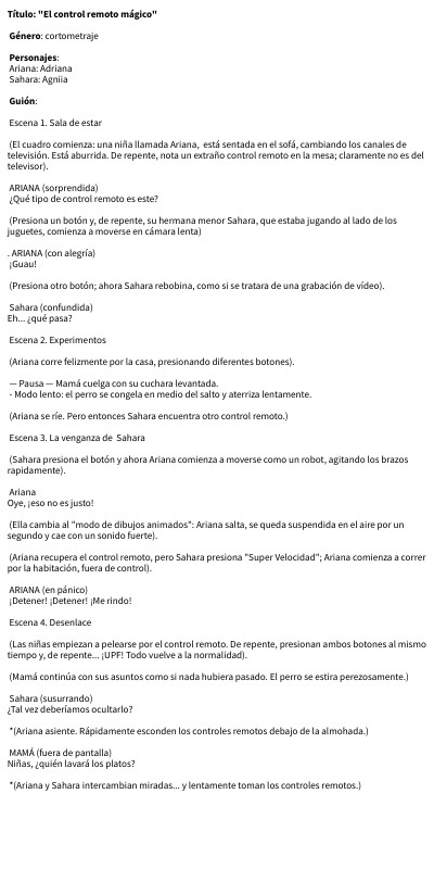 Título: "El control remoto mágico" Género: cortometraje Personajes: Ariana: Adriana Sahara: Agniia Guión: Escena 1. Sala de estar (El cuadro comienza: una niña llamada Ariana, está sentada en el sofá, cambiando los canales de televisión. Está aburrida. De repente, nota un extraño control remoto en la mesa; claramente no es del televisor). ARIANA (sorprendida) ¿Qué tipo de control remoto es este? (Presiona un botón y, de repente, su hermana menor Sahara, que estaba jugando al lado de los juguetes, comienza a moverse en cámara lenta) . ARIANA (con alegría) ¡Guau! (Presiona otro botón; ahora Sahara rebobina, como si se tratara de una grabación de vídeo). Sahara (confundida) Eh... ¿qué pasa? Escena 2. Experimentos (Ariana corre felizmente por la casa, presionando diferentes botones). — Pausa — Mamá cuelga con su cuchara levantada. - Modo lento: el perro se congela en medio del salto y aterriza lentamente. (Ariana se ríe. Pero entonces Sahara encuentra otro control remoto.) Escena 3. La venganza de Sahara (Sahara presiona el botón y ahora Ariana comienza a moverse como un robot, agitando los brazos rapidamente). Ariana Oye, ¡eso no es justo! (Ella cambia al "modo de dibujos animados": Ariana salta, se queda suspendida en el aire por un segundo y cae con un sonido fuerte). (Ariana recupera el control remoto, pero Sahara presiona "Super Velocidad"; Ariana comienza a correr por la habitación, fuera de control). ARIANA (en pánico) ¡Detener! ¡Detener! ¡Me rindo! Escena 4. Desenlace (Las niñas empiezan a pelearse por el control remoto. De repente, presionan ambos botones al mismo tiempo y, de repente... ¡UPF! Todo vuelve a la normalidad). (Mamá continúa con sus asuntos como si nada hubiera pasado. El perro se estira perezosamente.) Sahara (susurrando) ¿Tal vez deberíamos ocultarlo? *(Ariana asiente. Rápidamente esconden los controles remotos debajo de la almohada.) MAMÁ (fuera de pantalla) Niñas, ¿quién lavará los platos? *(Ariana y Sahara intercambian miradas... y lentamente toman los controles remotos.)