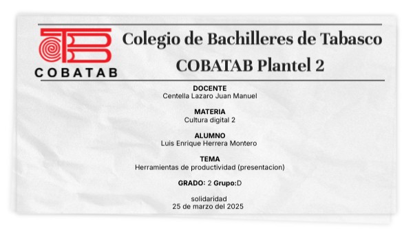 DOCENTE Centella Lazaro Juan Manuel MATERIA Cultura digital 2 ALUMNO Luis Enrique Herrera Montero TEMA Herramientas de productividad (presentacion) GRADO: 2 Grupo:D solidaridad 25 de marzo del 2025