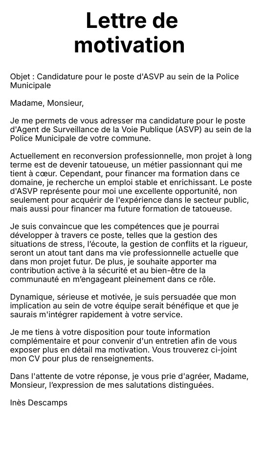 Objet : Candidature pour le poste d'Agent de Surveillance de la Voie Publique (ASVP) Madame, Monsieur, Actuellement à la recherche d'une première expérience professionnelle dans le domaine de la sécurité publique, je me permets de vous adresser ma candidature pour le poste d'Agent de Surveillance de la Voie Publique (ASVP) au sein de la Police Municipale de votre commune. Bien que je n'aie pas encore d'expérience professionnelle formelle, je suis convaincue que mes qualités personnelles, mon sens des responsabilités et ma motivation à apprendre rapidement feront de moi une candidate idéale pour ce poste. Ma capacité à travailler de manière autonome, mon sens de l'observation et ma rigueur sont des atouts que je suis prêt à mettre au service de votre équipe. Je suis particulièrement attirée par la fonction d'ASVP car elle représente une opportunité unique de participer à la sécurité de la ville tout en ayant un contact direct avec les citoyens. Le rôle de l'ASVP, allié surveillance, prévention et médiation, correspond parfaitement à mes valeurs et à mon souhait de contribuer activement à l'amélioration du cadre de vie et à la tranquillité publique. Sérieuse et dynamique, je suis prête à suivre la formation nécessaire pour être pleinement opérationnelle et à m'investir dans cette mission de service public. De plus, j'apprécie particulièrement le travail en équipe et je suis convaincue que mon enthousiasme et mon désir d'apprendre seront des atouts pour m'adapter rapidement aux exigences du poste. Je reste à votre disposition pour un entretien afin de discuter de mes motivations et de mes capacités à occuper ce poste. En espérant que ma candidature retiendra toute votre attention, je vous prie d'agréer, Madame, Monsieur, l'expression de mes salutations distinguées. Inès Descamps
