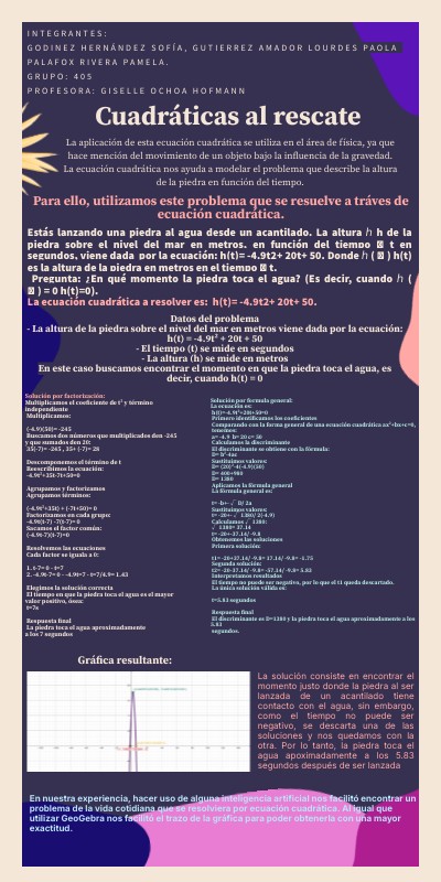 Solución por formula general: La ecuación es: h(t)=-4.9t²+20t+50=0 Primero identificamos los coeficientes Comparando con la forma general de una ecuación cuadrática ax²+bx+c=0, tenemos: a= -4.9 b= 20 c= 50 Calculamos la discriminante El discriminante se obtiene con la fórmula: D= b²-4ac Sustituimos valores: D= (20)²-4(-4.9)(50) D= 400+980 D= 1380 Aplicamos la fórmula general La fórmula general es: t= -b+- √ D/ 2a Sustituimos valores: t= -20+- √ 1380/ 2(-4.9) Calculamos √ 1380: √ 1380= 37.14 t= -20+-37.14/ -9.8 Obtenemos las soluciones Primera solución: t1= -20+37.14/ -9.8= 17.14/ -9.8= -1.75 Segunda solución: t2= -20-37.14/ -9.8= -57.14/ -9.8= 5.83 Interpretamos resultados El tiempo no puede ser negativo, por lo que el t1 queda descartado. La única solución válida es: t=5.83 segundos Respuesta final El discriminante es D=1380 y la piedra toca el agua aproximadamente a los 5.83 segundos.