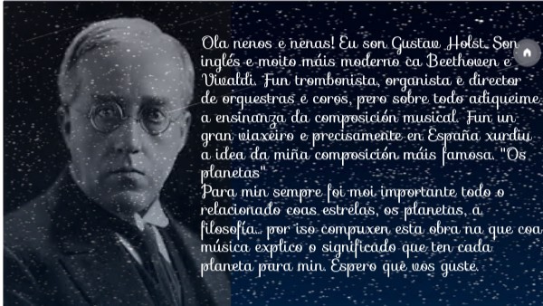 Ola nenos e nenas! Eu son Gustav Holst. Son inglés e moito máis moderno ca Beethoven e Vivaldi. Fun trombonista, organista e director de orquestras e coros, pero sobre todo adiqueime a ensinanza da composición musical. Fun un gran viaxeiro e precisamente en España xurdiu a idea da miña composición máis famosa. "Os planetas" Para min sempre foi moi importante todo o relacionado coas estrelas, os planetas, a filosofía... por iso compuxen esta obra na que coa música explico o significado que ten cada planeta para min. Espero que vos guste.