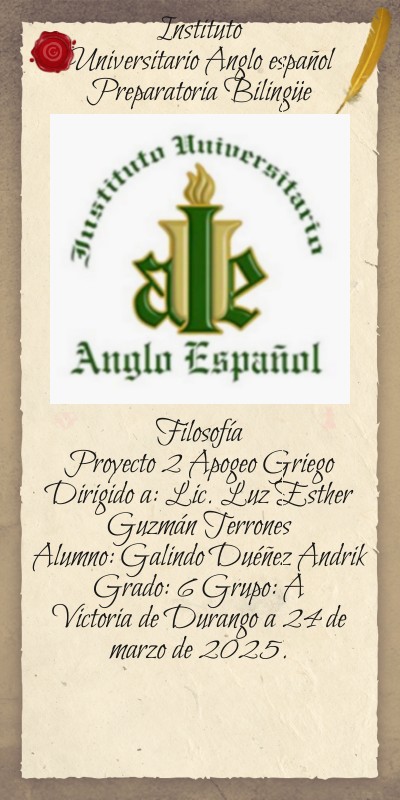 Instituto Universitario Anglo español Preparatoria Bilingüe Filosofía Proyecto 2 Apogeo Griego Dirigido a: Lic. Luz Esther Guzmán Terrones Alumno: Galindo Duéñez Andrik Grado: 6 Grupo: A Victoria de Durango a 24 de marzo de 2025.
