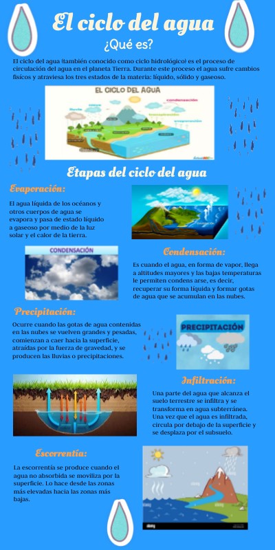 El ciclo del agua (también conocido como ciclo hidrológico) es el proceso de circulación del agua en el planeta Tierra. Durante este proceso el agua sufre cambios fisícos y atraviesa los tres estados de la materia: líquido, sólido y gaseoso.